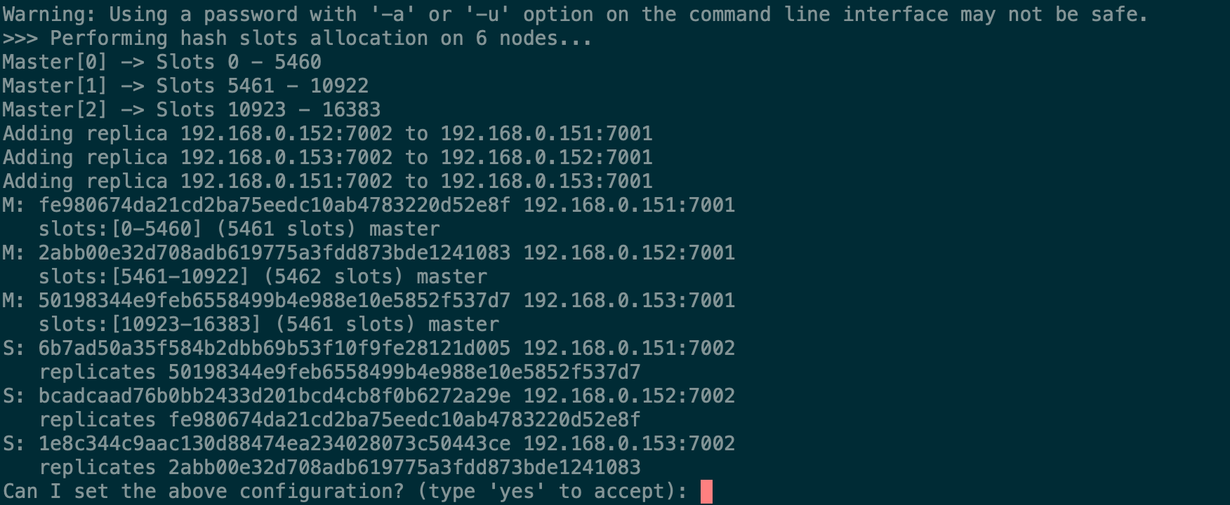 确认对应主从节点配置信息,前三台为主,后三天为从,如果在提示中确认主从没有问题,输入yes即可